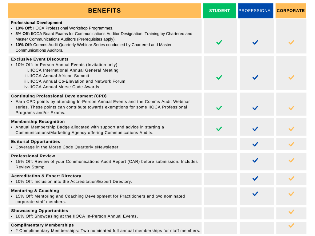 Designed for working professionals passionate about communication auditing, this membership is ideal for those looking to enhance their skills, stay informed about industry trends, and network with peers. Members enjoy exclusive access to industry research, professional workshops, and certification programs that support career advancement. Members are permitted to use (M.PRO) after their name within the Communications Auditing community.